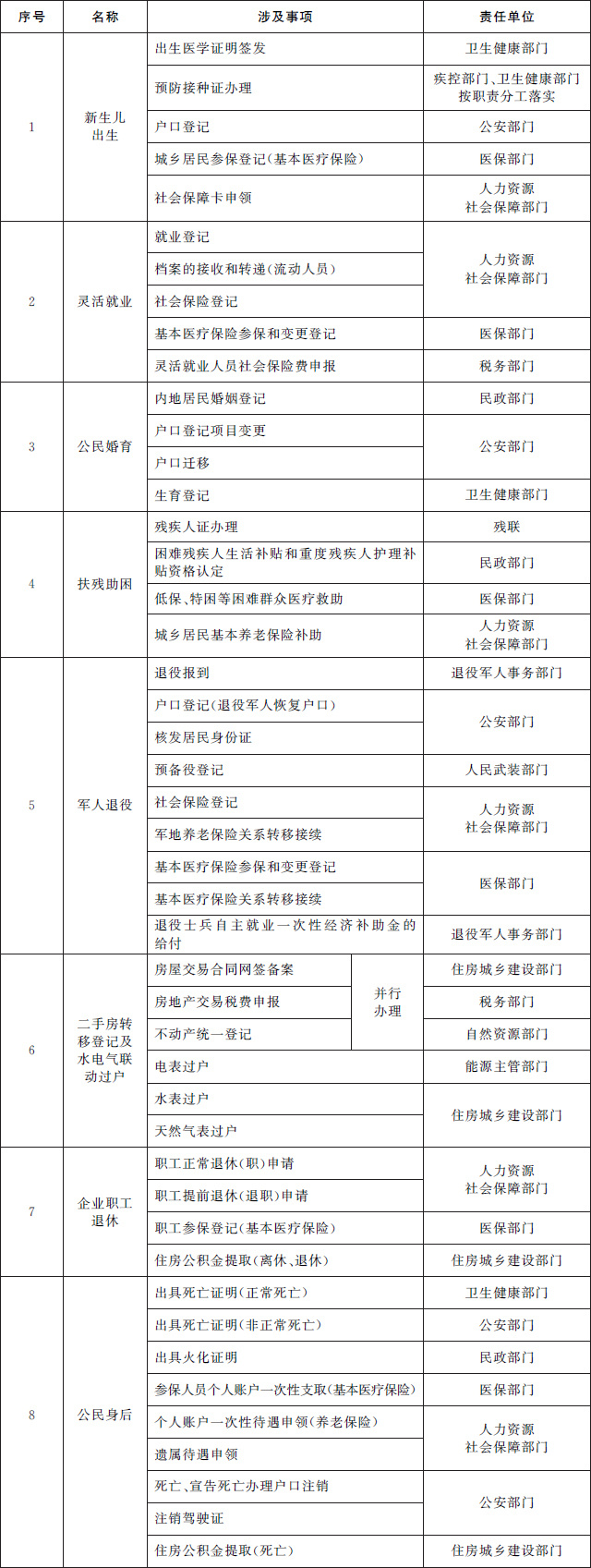 (二)推進(jìn)個(gè)人全生命周期相關(guān)政務(wù)服務(wù)事項“一件事一次辦”。圍繞個(gè)人從出生到身后全生命周期的重要階段,梳理集成同一階段內需要辦理的多個(gè)單一政務(wù)服務(wù)事項,為群眾提供新生兒出生、入園入學(xué)、大中專(zhuān)學(xué)生畢業(yè)、就業(yè)、就醫、婚育、扶殘助困、軍人退役、二手房交易及水電氣聯(lián)動(dòng)過(guò)戶(hù)、退休、身后等集成化辦理服務(wù),切實(shí)提升群眾辦事便捷度,減少跑動(dòng)次數。