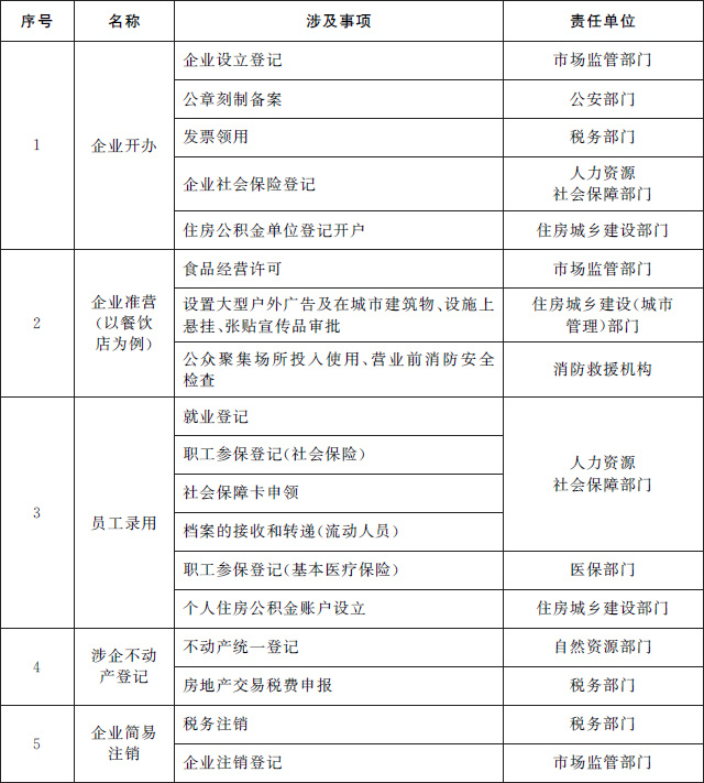 (一)推進(jìn)企業(yè)全生命周期相關(guān)政務(wù)服務(wù)事項“一件事一次辦”。圍繞企業(yè)從開(kāi)辦到注銷(xiāo)全生命周期的重要階段,梳理集成同一階段內需要到政府部門(mén)、公用企事業(yè)單位和服務(wù)機構辦理的多個(gè)單一政務(wù)服務(wù)事項,為企業(yè)提供開(kāi)辦、工程建設、生產(chǎn)經(jīng)營(yíng)、惠企政策兌現、員工錄用、不動(dòng)產(chǎn)登記、注銷(xiāo)等集成化辦理服務(wù),提高辦事效率,降低辦事成本。