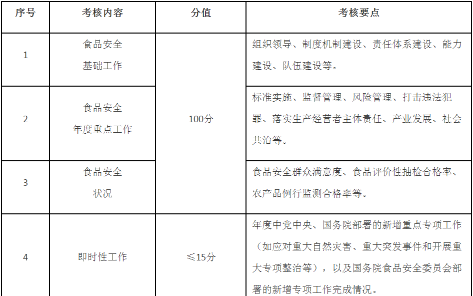 1.具體考核指標及分值根據年度重點(diǎn)工作進(jìn)行調整,由國務(wù)院食品安全辦在年度食品安全工作考核方案及其細則中明確。