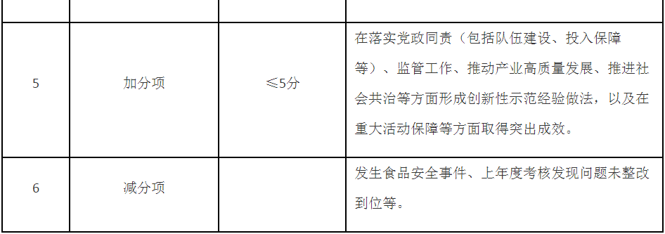 第五條 考核內容主要包括食品安全基礎工作推進(jìn)、年度重點(diǎn)工作落實(shí)、食品安全狀況等,同時(shí)設置即時(shí)性工作評價(jià)和加減分項(考核內容要點(diǎn)見(jiàn)附件)。具體考核指標及分值在年度食品安全工作考核方案及其細則中明確,設置要科學(xué)合理,可操作、可評價(jià)、可區分,切實(shí)減輕基層負擔。