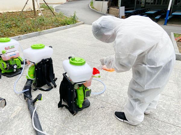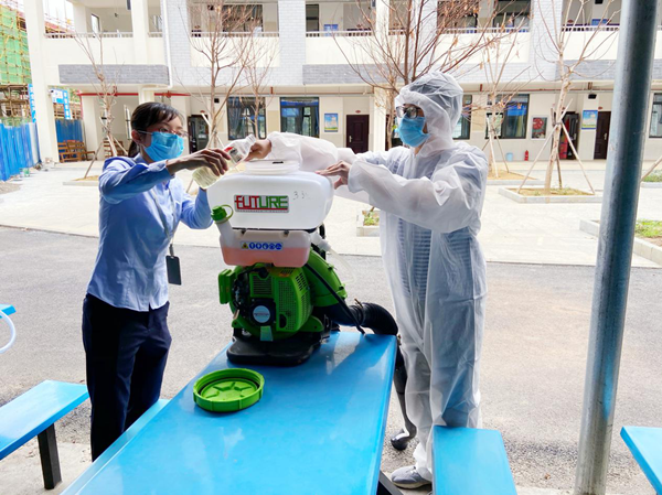 校區人員協(xié)助醫務(wù)人員添加消毒水