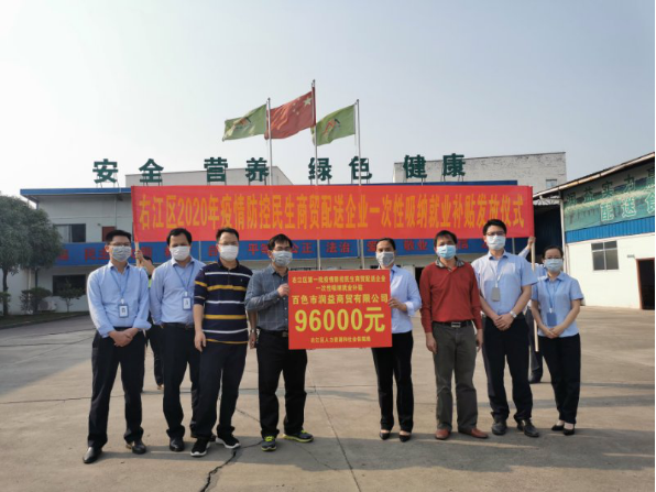 ??? 2020年2月29日,右江區人力資源和社會(huì )保障局黃彬副局長(cháng)、就業(yè)服務(wù)中心黃瑞珉主任、右江區國有資產(chǎn)管理中心黃紹雷副主任,在潤益商貿公司舉行2020年疫情防控民生商貿配送企業(yè)一次性吸納就業(yè)補貼發(fā)放儀式。