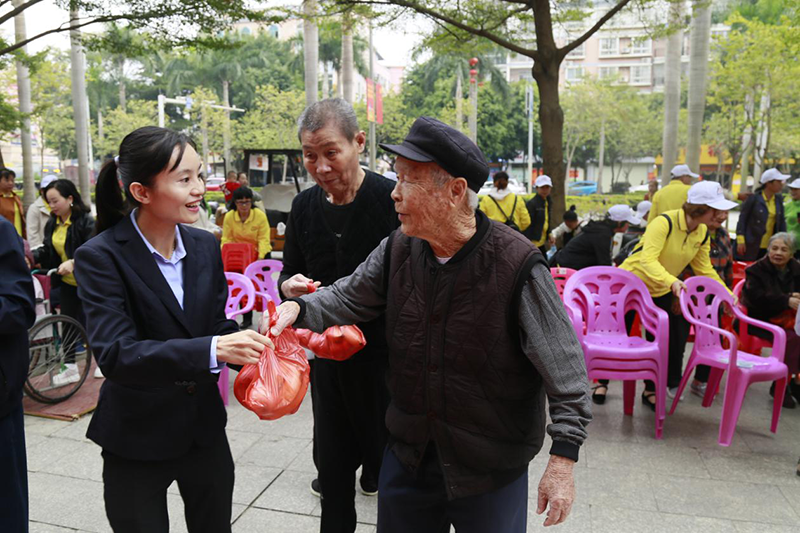 益眾托管公司的志愿者給華宇樂(lè )安老人們贈送小禮品