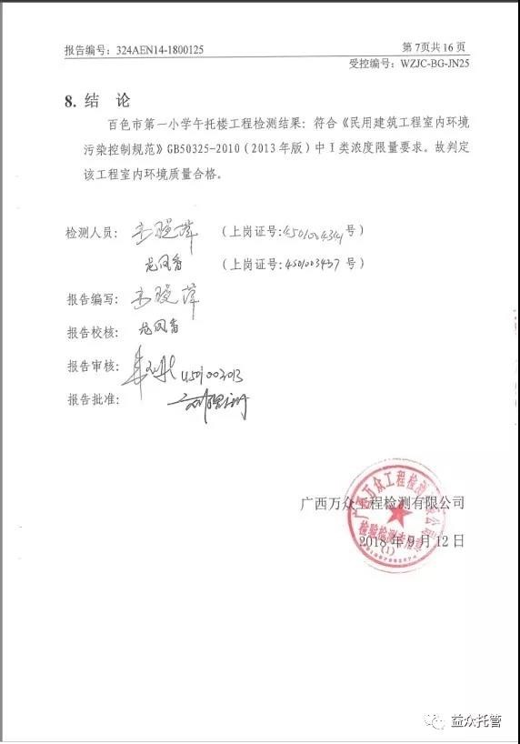 2??018年9月27日,廣西萬(wàn)眾工程檢測有限公司提交了檢測報告,新托管樓室內、室外檢測點(diǎn)甲醛、氨、苯、TVOC、氡濃度指標均符合《民用建筑工程室內環(huán)境污染控制規范》GB50325-2010(2013年版)中I類(lèi)濃度限量要求,室內環(huán)境質(zhì)量合格。