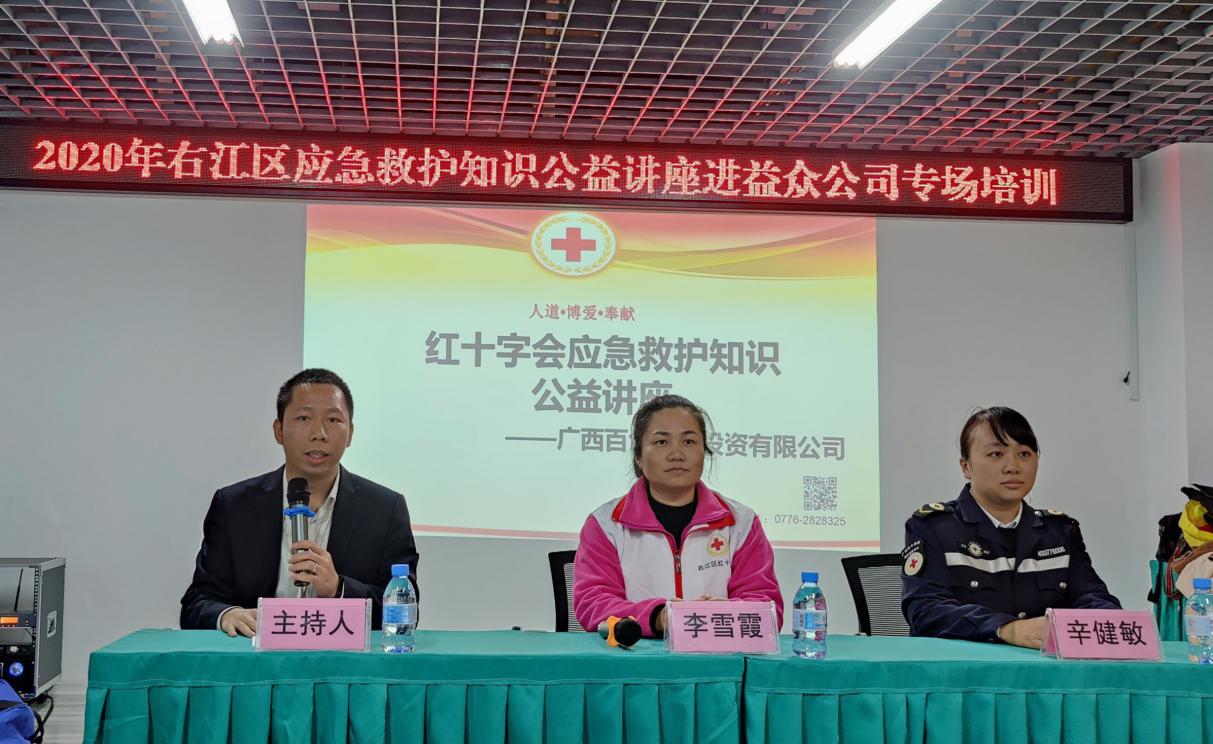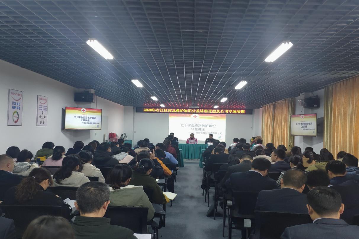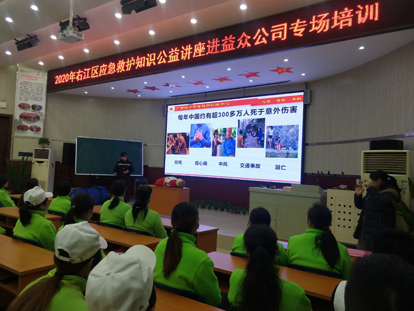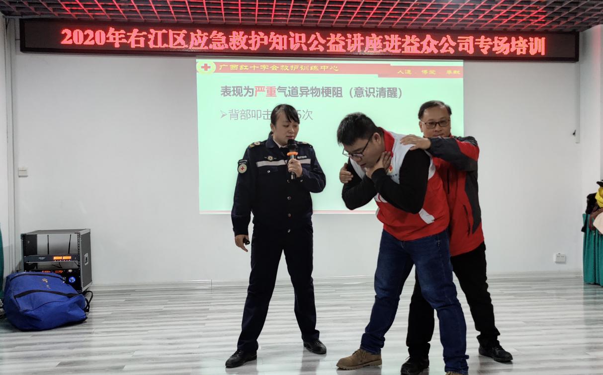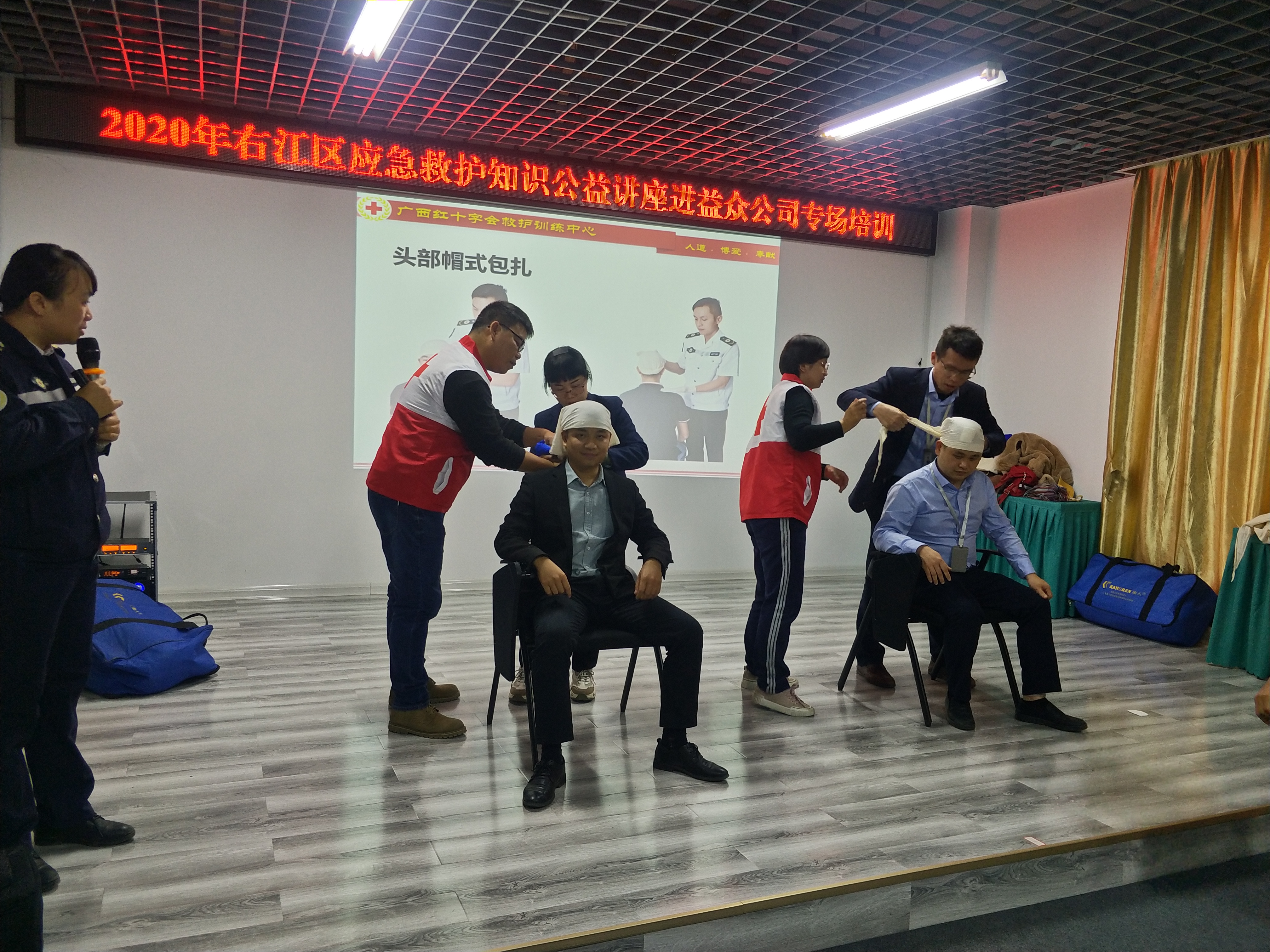 ????????為普及應急救護知識,提高員工安全防范意識、自救互救能力和應急救護技能,12月2日、6日,益眾公司邀請百色市右江區紅十字會(huì )到公司開(kāi)展急救知識技能培訓,公司百余名管理人員、有關(guān)直屬班組400余人參加培訓。