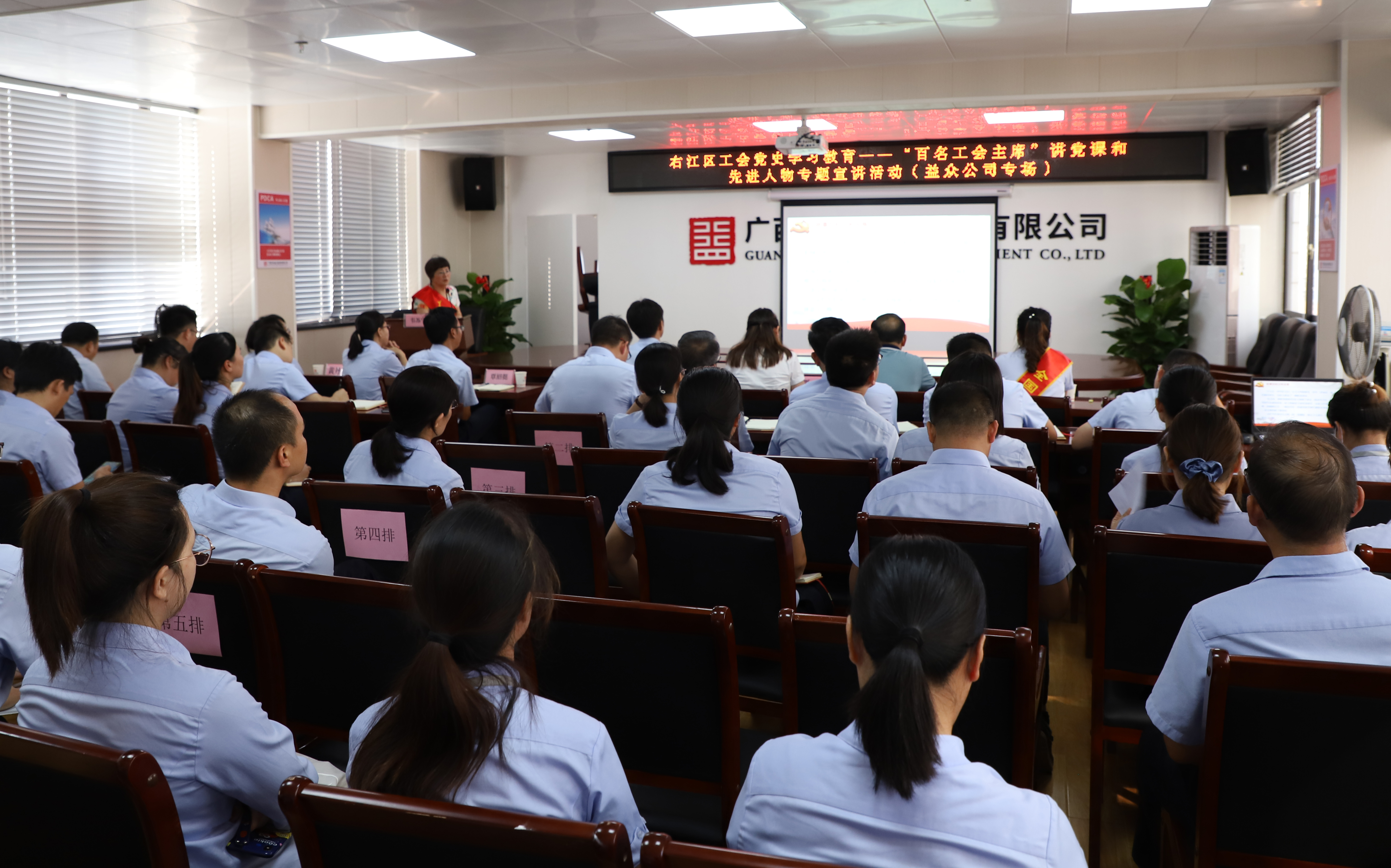 ????????6月18日,百色市工會(huì )黨史學(xué)習教育——“百名工會(huì )主席”講黨課和先進(jìn)人物專(zhuān)題宣講活動(dòng)(益眾公司專(zhuān)場(chǎng))在益眾公司城北路辦公區11樓會(huì )議室舉行。百色市總工會(huì )黨組成員、經(jīng)審會(huì )主任黃光日,全國先進(jìn)工作者、全國五一勞動(dòng)獎?wù)?、國家稅?wù)總局百色市右江區稅務(wù)局稅源管理股副股長(cháng)林恒和自治區先進(jìn)工作者、廣西特級教師、自治區德育先進(jìn)工作者百色市逸夫小學(xué)校長(cháng)韋蘇寧分別作黨史黨課、黨史學(xué)習教育宣講報告,右江區總工會(huì )黨組書(shū)記、常務(wù)副主席覃璘清主持會(huì )議。益眾公司領(lǐng)導、全體黨員、入黨積極分子、職工代表等約80人參加宣講活動(dòng)。