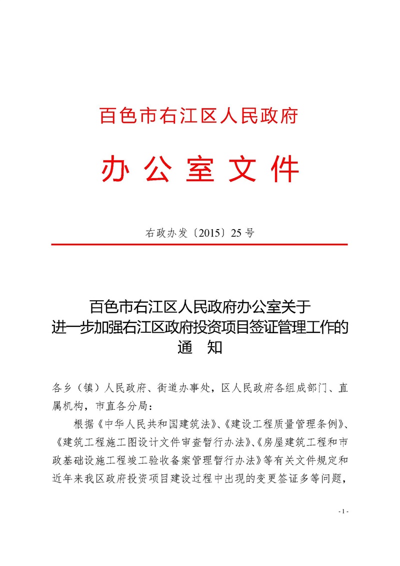 右政辦發(fā)[2015]25號 關(guān)于進(jìn)一步加強右江區政府投資項目簽證管理工作的通知