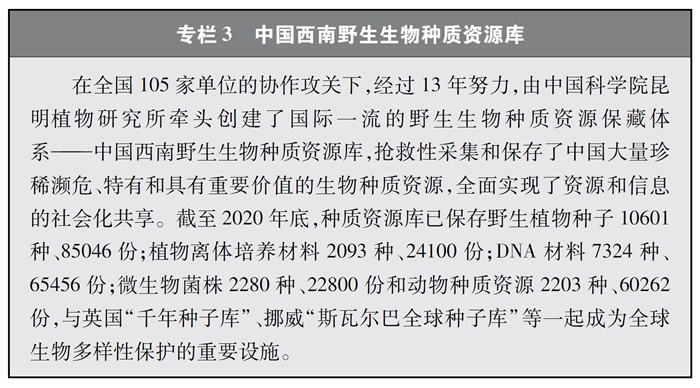 加快重要生物遺傳資源收集保存和利用。中國高度重視生物資源保護,近年來(lái)在生物資源調查、收集、保存等方面取得較大進(jìn)展。實(shí)施戰略生物資源計劃專(zhuān)項,完善生物資源收集收藏平臺,建立種質(zhì)資源創(chuàng )新平臺、遺傳資源衍生庫和天然化合物轉化平臺,持續加強野生生物資源保護和利用。實(shí)施一批種質(zhì)資源保護和育種創(chuàng )新項目,截至2020年底,形成了以國家作物種質(zhì)長(cháng)期庫及其復份庫為核心、10座中期庫與43個(gè)種質(zhì)圃為支撐的國家作物種質(zhì)資源保護體系,建立了199個(gè)國家級畜禽遺傳資源保種場(chǎng)(區、庫),為90%以上的國家級畜禽遺傳資源保護名錄品種建立了國家級保種單位,長(cháng)期保存作物種質(zhì)資源52萬(wàn)余份、畜禽遺傳資源96萬(wàn)份。建設99個(gè)國家級林木種質(zhì)資源保存庫,以及新疆、山東2個(gè)國家級林草種質(zhì)資源設施保存庫國家分庫,保存林木種質(zhì)資源4.7萬(wàn)份。建設31個(gè)藥用植物種質(zhì)資源保存圃和2個(gè)種質(zhì)資源庫,保存種子種苗1.2萬(wàn)多份。