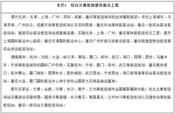 優(yōu)化綜合交通樞紐城市功能。提升國際性綜合交通樞紐的全球聯(lián)通水平和資源要素配置能力,增強部分樞紐國際門(mén)戶(hù)功能。優(yōu)化全國性綜合交通樞紐客貨中轉設施、集疏運網(wǎng)絡(luò )及客運場(chǎng)站間快速連接系統。增強區域性綜合交通樞紐的銜接轉運能力,發(fā)展口岸樞紐。強化不同層級綜合交通樞紐城市之間功能互補、設施連通、運行協(xié)同。
