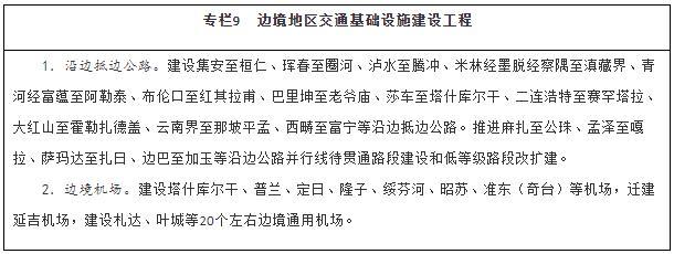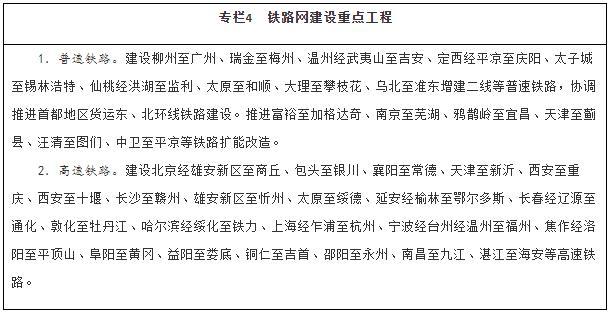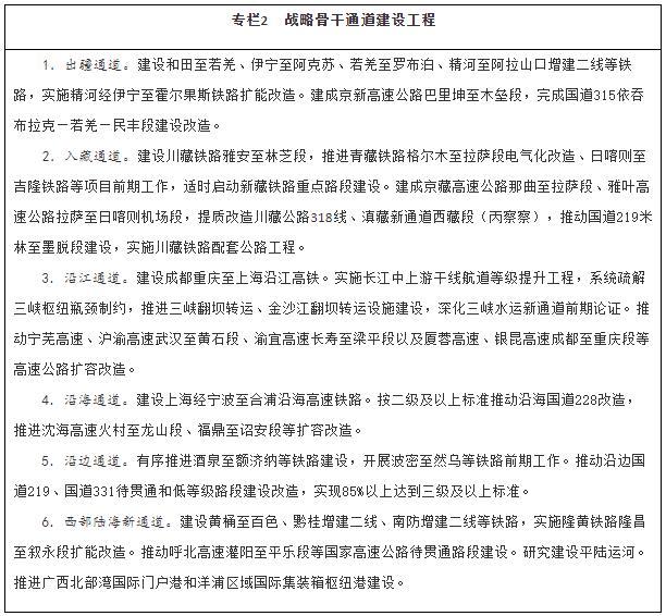 加強戰略骨干通道建設。推進(jìn)出疆入藏通道建設,擴大甘新、青新、青藏、川藏四條內聯(lián)主通道通行能力,穩步推進(jìn)川藏鐵路建設,加快推進(jìn)新藏鐵路和田至日喀則段前期工作、適時(shí)啟動(dòng)重點(diǎn)路段建設,有序推進(jìn)滇藏鐵路前期工作,密實(shí)優(yōu)化航空航線(xiàn)網(wǎng)絡(luò )布局,構建多向聯(lián)通的通道布局。暢通沿江通道,加快建設沿江高鐵,優(yōu)化以高等級航道和干線(xiàn)鐵路、高速公路為骨干的沿江綜合運輸大通道功能。升級沿海通道,提高鐵路通道能力,推進(jìn)高速公路繁忙路段擴容改造,提升港口航道整體效能,構建大容量、高品質(zhì)的運輸走廊。貫通沿邊通道,提級改造普通國省干線(xiàn),推進(jìn)重點(diǎn)方向沿邊鐵路建設,提高安全保障水平。建設西部陸海新通道,發(fā)揮鐵路在陸路運輸中的骨干作用和港口在海上運輸中的門(mén)戶(hù)作用,強化東、中、西三條通路,形成大能力主通道,銜接國際運輸通道。