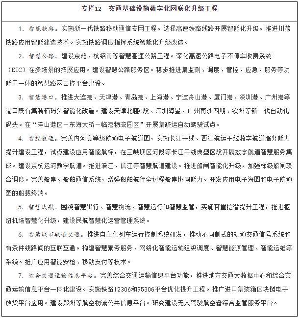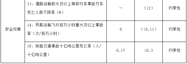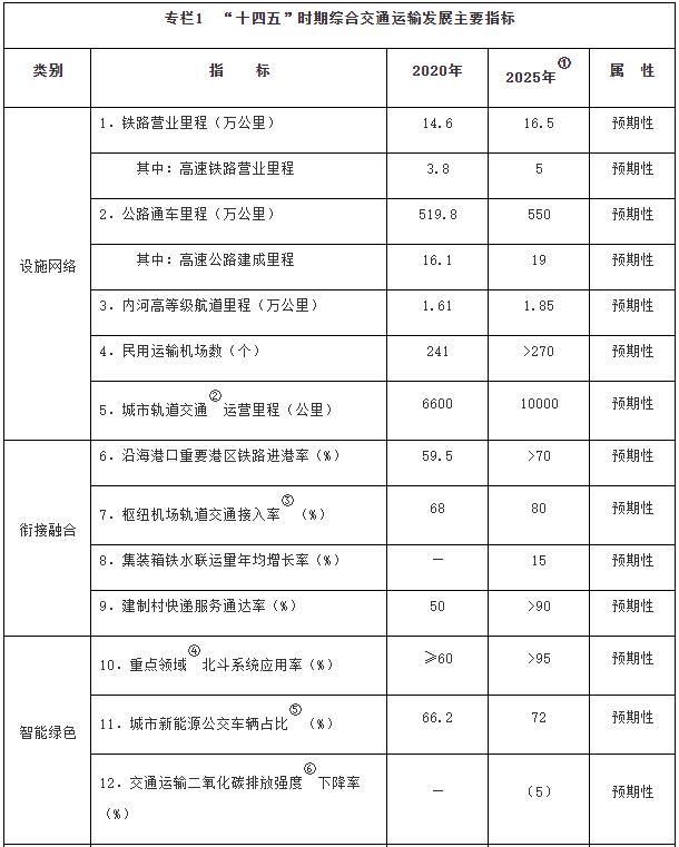 注:①〔〕內為5年累計數。②指納入國家批準的城市軌道交通建設規劃中的大中運量城市軌道交通項目。③指國際樞紐機場(chǎng)和區域樞紐機場(chǎng)中連通軌道交通的機場(chǎng)數量占比。④指重點(diǎn)營(yíng)運車(chē)輛、郵政快遞自有干線(xiàn)運輸車(chē)輛、應安裝具備衛星定位功能船載設備的客船及危險品船等。⑤指新能源公交車(chē)輛占所有地面公交車(chē)輛的比重。⑥指按單位運輸周轉量計算的二氧化碳排放。