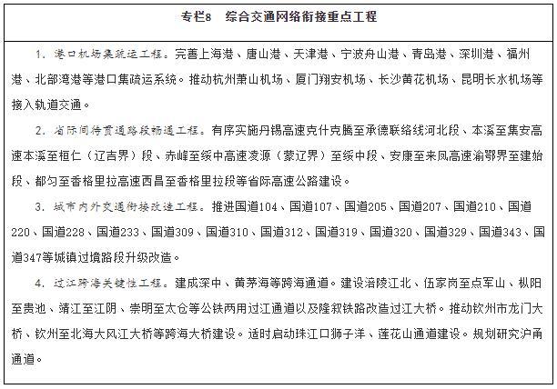 建設多節點(diǎn)、網(wǎng)格狀、全覆蓋的京津冀一體化綜合交通網(wǎng)絡(luò ),基本建成軌道上的京津冀,高標準、高質(zhì)量打造雄安新區對外交通網(wǎng)絡(luò ),加強北京城市副中心與中心城區、廊坊北三縣交通基礎設施互聯(lián)互通,強化北京冬奧會(huì )、冬殘奧會(huì )交通保障。依托長(cháng)江黃金水道,整體設計推進(jìn)長(cháng)江經(jīng)濟帶綜合交通運輸體系建設,補強沿江高鐵和鐵路貨運能力,全力打通公路省際待貫通路段,提升江海聯(lián)運、鐵水聯(lián)運發(fā)展水平。推進(jìn)粵港澳大灣區基礎設施互聯(lián)互通,優(yōu)化航運和航空資源配置,加強港澳與內地的交通聯(lián)系,支持香港提升國際航運、國際航空樞紐地位。推動(dòng)長(cháng)三角地區交通運輸更高質(zhì)量一體化發(fā)展,加快對外交通、城際交通、都市圈交通高效銜接和有機融合,協(xié)同推進(jìn)港航、海事一體化發(fā)展,推動(dòng)上海市、江蘇省、浙江省、安徽省共建輻射全球的航運樞紐,加快提升江蘇通州灣江海聯(lián)動(dòng)示范區功能,打造長(cháng)江集裝箱運輸新出???。構建海南島內暢通、陸島連通、全球通達的現代綜合交通運輸體系,建設現代化綜合交通樞紐,穩步推進(jìn)自由貿易港建設。構建黃河流域綠色安全便捷綜合交通網(wǎng)絡(luò ),強化跨區域大通道建設。