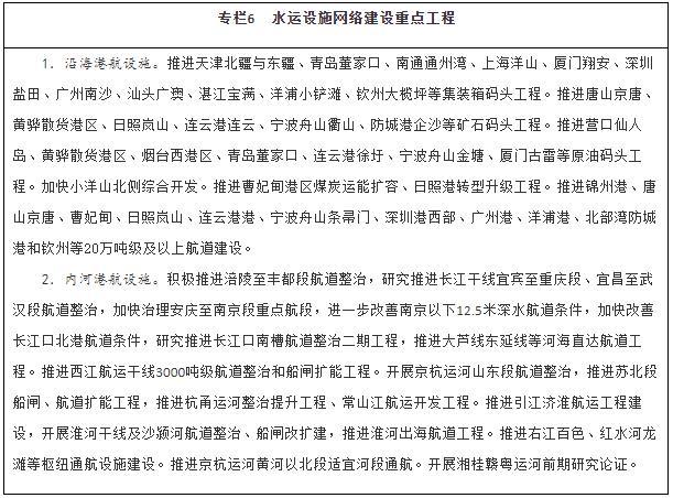 優(yōu)化暢通水運設施網(wǎng)絡(luò )。建設京津冀、長(cháng)三角、粵港澳大灣區世界級港口群,支持山東打造世界一流的海洋港口,推進(jìn)東北地區沿海港口一體化發(fā)展,優(yōu)化港口功能布局,推動(dòng)資源整合和共享共用。有序推進(jìn)沿海港口專(zhuān)業(yè)化碼頭及進(jìn)出港航道等公共設施建設。適度超前建設糧食、能源、礦產(chǎn)資源的接卸、儲存、中轉設施,推進(jìn)沿海沿江液化天然氣碼頭規劃建設。提升內河港口專(zhuān)業(yè)化、規?;?,合理集中布局集裝箱、煤炭、鐵礦石、商品汽車(chē)等專(zhuān)業(yè)化碼頭。加強內河高等級航道擴能升級與暢通攻堅建設,完善長(cháng)江、珠江、京杭運河和淮河等水系內河高等級航道網(wǎng)絡(luò ),進(jìn)一步提升珠三角高等級航道網(wǎng)出海能力,全面加強長(cháng)三角、珠江—西江高等級航道網(wǎng)未達標段建設。推動(dòng)重要支流航道和庫湖區航道、內河旅游航道、便民碼頭建設。