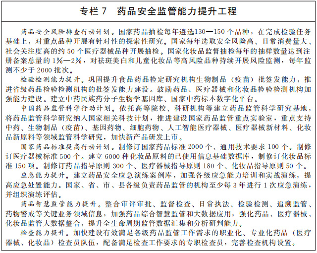 完善藥品安全監管制度。加強藥物臨床試驗核查,嚴格執行藥品、醫療器械、化妝品等生產(chǎn)質(zhì)量管理規范,對重點(diǎn)生產(chǎn)企業(yè)開(kāi)展全覆蓋檢查。開(kāi)展藥品質(zhì)量提升行動(dòng),健全生物制品等高風(fēng)險產(chǎn)品標準制定工作機制,提高藥品、醫療器械、化妝品標準。改革和完善疫苗監管體制機制,提高省級藥品檢驗檢測機構對轄區內生產(chǎn)的主要疫苗品種批簽發(fā)能力。深入開(kāi)展無(wú)菌植入性醫療器械監督檢查、化妝品“線(xiàn)上凈網(wǎng)、線(xiàn)下清源”等專(zhuān)項整治行動(dòng),切實(shí)規范藥品、醫療器械、化妝品市場(chǎng)秩序。
