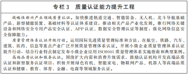 提高質(zhì)量認證服務(wù)能力。加快構建統一管理、共同實(shí)施、權威公信、通用互認的質(zhì)量認證體系,全面提升質(zhì)量認證服務(wù)能力,打造一批具有國際競爭力的認證品牌。推動(dòng)完善重點(diǎn)產(chǎn)業(yè)質(zhì)量認證制度體系,加大網(wǎng)絡(luò )安全認證制度推行力度,加快戰略性新興產(chǎn)業(yè)領(lǐng)域質(zhì)量認證制度建設,大力推行高端品質(zhì)認證和新型服務(wù)認證,加快研究和完善國家數據安全標準與認證認可體系。廣泛開(kāi)展質(zhì)量管理體系認證升級行動(dòng)。健全政府、行業(yè)、社會(huì )等多層面的認證采信機制,推動(dòng)在市場(chǎng)采購、行業(yè)管理、行政監管、社會(huì )治理等領(lǐng)域廣泛采信認證結果。提升認證行業(yè)專(zhuān)業(yè)化集約化水平,優(yōu)化行業(yè)布局結構,推動(dòng)認證行業(yè)數字化發(fā)展。