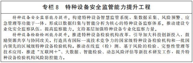 強化特種設備安全風(fēng)險監控體系建設。優(yōu)化特種設備監管信息化建設基礎和應用環(huán)境,推動(dòng)國家與地方監管數據互聯(lián)互通,增強數據分析和信用管理功能,完善全國統一的特種設備信息公示查詢(xún)系統。加強特種設備風(fēng)險預警與應急處置能力建設,提高安全風(fēng)險識別和防控能力。推動(dòng)特種設備使用單位開(kāi)展風(fēng)險分級管控,從源頭上系統辨識風(fēng)險、防控風(fēng)險。完善生產(chǎn)單位、檢驗檢測機構和人員資格信息等特種設備基礎數據庫。以電梯、氣瓶和移動(dòng)式壓力容器、叉車(chē)等為重點(diǎn),建立健全特種設備質(zhì)量安全管理追溯體系。推動(dòng)特種設備生產(chǎn)企業(yè)加大研發(fā)投入,建立科學(xué)嚴密、反應及時(shí)的風(fēng)險防范系統。完善鍋爐安全、節能、環(huán)保三位一體的監管體系,以實(shí)現碳達峰碳中和目標為導向,進(jìn)一步提升鍋爐節能環(huán)保水平。