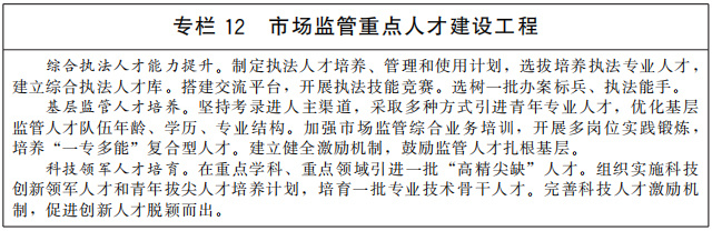 加強人才隊伍建設。健全人才引進(jìn)、培養、使用、評價(jià)、激勵機制,統籌推進(jìn)市場(chǎng)監管人才隊伍建設。加快高水平市場(chǎng)監管智庫和綜合型研究機構建設,加強重大理論和實(shí)踐問(wèn)題戰略研究、決策咨詢(xún),開(kāi)展人才需求分析。推進(jìn)市場(chǎng)監管人才培養,加快相關(guān)學(xué)科專(zhuān)業(yè)建設,培養符合市場(chǎng)監管現代化需求的后備人才。在檢驗檢測、藥品審評、檢查核查、網(wǎng)絡(luò )數據監管、知識產(chǎn)權、質(zhì)量技術(shù)等重點(diǎn)專(zhuān)業(yè)領(lǐng)域,著(zhù)力培養引進(jìn)一批“高精尖缺”人才。組織開(kāi)展綜合執法大練兵,提升基層人才隊伍能力水平。加強市場(chǎng)監管文化建設,增進(jìn)價(jià)值認同、情感認同、文化認同,增強做好市場(chǎng)監管工作的責任感和使命感。