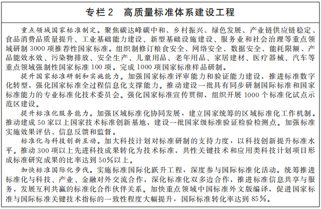 深化標準化改革創(chuàng )新。加快標準供給由政府主導向政府與市場(chǎng)并重轉變,標準運用由產(chǎn)業(yè)與貿易為主向經(jīng)濟社會(huì )全域轉變,標準化工作由國內驅動(dòng)向國內國際相互促進(jìn)轉變,標準化發(fā)展由數量規模型向質(zhì)量效益型轉變。持續優(yōu)化政府頒布標準與市場(chǎng)自主制定標準協(xié)調配合的新型標準體系,推動(dòng)一般性產(chǎn)品、服務(wù)標準由市場(chǎng)自主制定,建立健全政府頒布標準采信市場(chǎng)自主制定標準的機制。建立法規引用標準制度,強化法規與標準有效協(xié)調機制,運用標準支撐法規落地實(shí)施。加強標準化技術(shù)組織建設,提升國家標準研制和實(shí)施能力。加強國家技術(shù)標準創(chuàng )新基地和國家級標準驗證檢驗檢測點(diǎn)建設,提升標準化技術(shù)支撐水平。實(shí)施標準全生命周期閉環(huán)管理,完善標準實(shí)施信息反饋與評估制度,建立國家標準動(dòng)態(tài)維護機制。開(kāi)展對標達標專(zhuān)項行動(dòng),推動(dòng)團體標準培優(yōu)計劃和企業(yè)標準領(lǐng)跑者制度實(shí)施,消除標準制定團體培育發(fā)展的政策障礙,釋放企業(yè)、社會(huì )團體標準化活力。