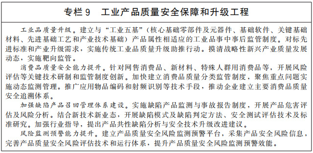 加大消費品安全監管力度。推動(dòng)企業(yè)建立主要消費品質(zhì)量安全追溯體系,記錄重點(diǎn)環(huán)節過(guò)程信息,實(shí)現產(chǎn)品質(zhì)量安全問(wèn)題可追溯。健全缺陷產(chǎn)品召回制度,加強大中型客貨車(chē)、新能源汽車(chē)與智能網(wǎng)聯(lián)汽車(chē)、智能家居、兒童用品、電子電器等重點(diǎn)產(chǎn)品召回管理,強化重大案件調查與召回后續監督工作,完善缺陷產(chǎn)品召回技術(shù)支撐體系。完善產(chǎn)品傷害監測制度,拓寬監測信息采集渠道,增加監測點(diǎn),推進(jìn)產(chǎn)品傷害預防干預。完善產(chǎn)品質(zhì)量安全事故強制報告和調查處理制度,提高質(zhì)量安全事故人身傷害賠償標準。