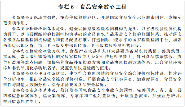 健全食品安全風(fēng)險防控機制。進(jìn)一步強化食品安全風(fēng)險監測評估對監督管理的科學(xué)支撐,加強風(fēng)險監測和監督管理各環(huán)節的信息化平臺建設和信息共享。面向醫院、學(xué)校、托育機構等重點(diǎn)場(chǎng)所,科學(xué)布局食品安全風(fēng)險監測點(diǎn),提升風(fēng)險監測覆蓋面和問(wèn)題發(fā)現率。聚焦執法、司法重點(diǎn)難點(diǎn)問(wèn)題,提高食品安全檢驗檢測和技術(shù)鑒定能力。加快重點(diǎn)品種食品安全信息化追溯體系建設,鼓勵生產(chǎn)經(jīng)營(yíng)企業(yè)、行業(yè)協(xié)會(huì )和第三方平臺向政府信息平臺開(kāi)放數據。深化食品安全抽檢制度改革,明確監督抽檢、風(fēng)險監測與評價(jià)性抽檢的功能定位,以功能為導向優(yōu)化實(shí)施機制,推進(jìn)“你點(diǎn)我檢”“你送我檢”常態(tài)化,強化抽檢監測的隱患排查和風(fēng)險管控作用。穩步實(shí)現農產(chǎn)品和食品抽檢量每年5批次/千人目標,其中種養殖環(huán)節抽檢量每年2批次/千人。依托現有資源加強職業(yè)化食品安全檢查員隊伍建設,完善相應技術(shù)職務(wù)體系,提高檢查人員專(zhuān)業(yè)技能。加強食品安全風(fēng)險預警交流體系建設。加大農產(chǎn)品質(zhì)量安全風(fēng)險評估力度。強化食品和農產(chǎn)品安全突發(fā)事件應急處置,提升應急響應、現場(chǎng)處置、醫療救治能力。
