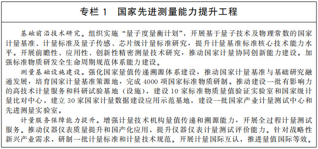 構建現代先進(jìn)測量體系。加強以量子計量為核心的先進(jìn)測量體系建設,加快建立新一代國家計量基準,推進(jìn)社會(huì )公用計量標準升級換代,制定一批關(guān)系國計民生的重要計量技術(shù)規范。改革完善計量器具型式批準、檢定、法制監督等管理制度,對強制管理的計量器具目錄實(shí)施動(dòng)態(tài)調整,完善商品量、計量數據等量值監管制度。深入推進(jìn)計量技術(shù)機構改革創(chuàng )新發(fā)展,探索計量校準市場(chǎng)和校準機構建設的有效途徑,規范計量校準市場(chǎng),滿(mǎn)足市場(chǎng)對量值溯源和測試服務(wù)的需求。建立國家計量數據建設應用示范基地,提升國家產(chǎn)業(yè)計量測試和能源計量能力。積極參與國際計量比對,提升國際承認的校準與測量能力。