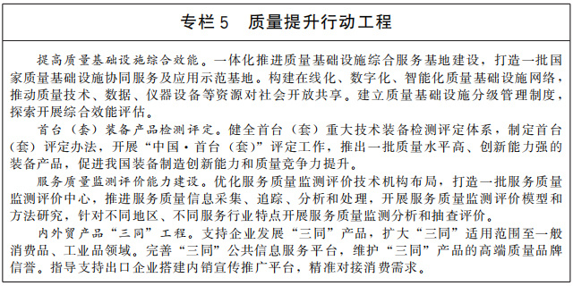 完善質(zhì)量管理制度。建立健全質(zhì)量統計監測體系,開(kāi)展高質(zhì)量發(fā)展綜合績(jì)效評價(jià),完善質(zhì)量安全與質(zhì)量發(fā)展監測指標。完善質(zhì)量激勵政策,開(kāi)展中國質(zhì)量獎評選表彰活動(dòng),建立政府質(zhì)量獎獲獎企業(yè)和個(gè)人先進(jìn)質(zhì)量管理經(jīng)驗宣傳推廣機制,引導各行業(yè)加強全面質(zhì)量管理。完善質(zhì)量提升資金多元籌集和保障機制,加強對質(zhì)量創(chuàng )新和質(zhì)量提升的支持。
