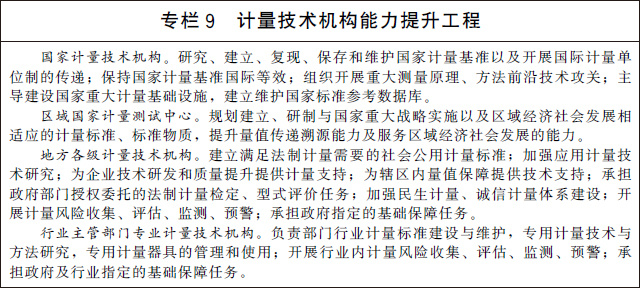 (二十一)加快計量技術(shù)機構建設。深化計量技術(shù)機構改革創(chuàng )新發(fā)展,優(yōu)化整合國家計量技術(shù)機構、區域國家計量測試中心、地方各級計量技術(shù)機構和行業(yè)主管部門(mén)專(zhuān)業(yè)計量技術(shù)機構。大力推動(dòng)國家計量技術(shù)機構創(chuàng )新發(fā)展,通過(guò)組織開(kāi)展重大測量原理、方法前沿技術(shù)攻關(guān),建立量子計量基準并保持國際等效,提供一流的量值溯源和測量服務(wù),支撐國家科技創(chuàng )新、工業(yè)競爭力提升和經(jīng)濟社會(huì )發(fā)展。充分發(fā)揮省級人民政府和行業(yè)主管部門(mén)計量基礎設施規劃建設自主權,加強普惠性、基礎性和公益性計量基礎設施建設。提升計量技術(shù)機構服務(wù)市場(chǎng)的能力和水平,推動(dòng)形成一批專(zhuān)業(yè)領(lǐng)域服務(wù)平臺,培育一批專(zhuān)業(yè)化、社會(huì )化、網(wǎng)絡(luò )化的服務(wù)機構,為經(jīng)濟社會(huì )發(fā)展和行業(yè)創(chuàng )新提供計量測試服務(wù)。