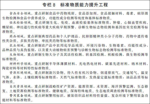 (二十)加大標準物質(zhì)研制應用。建立完善以國家基準物質(zhì)、國家標準物質(zhì)和工作標準物質(zhì)為主要組成部分的標準物質(zhì)體系。實(shí)施標準物質(zhì)能力提升工程,加快生命科學(xué)、生物醫藥、環(huán)境監測、食品安全、自然資源、刑事司法等重點(diǎn)領(lǐng)域的標準物質(zhì)研制和應用。加強標準物質(zhì)監管能力建設和關(guān)鍵共性技術(shù)研究,提升標準物質(zhì)不確定度水平。探索建立標準物質(zhì)質(zhì)量追溯制度,建設一批標準物質(zhì)量值核查驗證實(shí)驗室,建立標準物質(zhì)質(zhì)量追溯平臺,形成研發(fā)、生產(chǎn)、應用全壽命周期的監管能力。