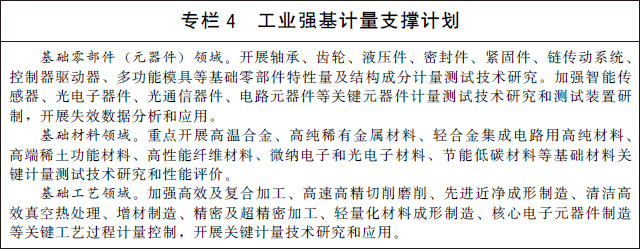 (九)支撐先進(jìn)制造與質(zhì)量提升。實(shí)施制造業(yè)計量能力提升工程,建立一批先進(jìn)制造業(yè)發(fā)展急需的高準確度、高穩定性計量基準、標準。在戰略性新興產(chǎn)業(yè)和現代服務(wù)業(yè)等領(lǐng)域,建設一批國家產(chǎn)業(yè)計量測試中心和聯(lián)盟,搭建計量公共服務(wù)平臺,聚焦制造業(yè)領(lǐng)域測不了、測不全、測不準難題,加強關(guān)鍵計量測試技術(shù)、測量方法研究和裝備研制,為產(chǎn)業(yè)發(fā)展提供全溯源鏈、全產(chǎn)業(yè)鏈、全壽命周期并具有前瞻性的計量測試服務(wù)。開(kāi)展產(chǎn)業(yè)計量基礎能力提升行動(dòng),實(shí)施工業(yè)強基計量支撐計劃,充分發(fā)揮計量對基礎零部件(元器件)、基礎材料、基礎工藝的技術(shù)支撐和保障作用。研究建立國家工業(yè)計量基礎數據庫,加強工業(yè)制造領(lǐng)域計量檢定、校準、測試和檢測數據的采集、管理和應用。