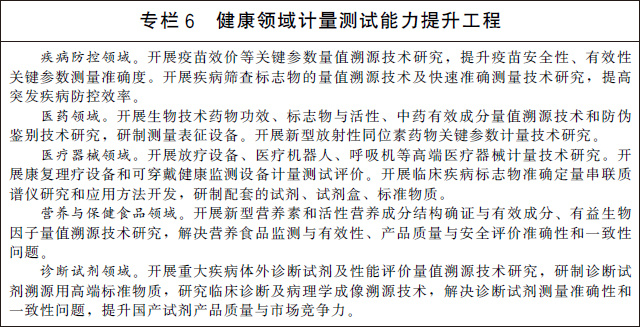 (十五)服務(wù)大眾健康與安全。加快醫療健康領(lǐng)域計量服務(wù)體系建設,圍繞疾病防控、生物醫藥、診斷試劑、高端醫療器械、康復理療設備、可穿戴設備、營(yíng)養與保健食品等開(kāi)展關(guān)鍵計量測試技術(shù)研究和應用。加強體育設施和器材計量技術(shù)研究和測試服務(wù),促進(jìn)體育產(chǎn)業(yè)高質(zhì)量發(fā)展。完善地質(zhì)和海洋災害、地震、洪澇干旱、森林草原火災等自然災害防御的計量保障體系,提高防災、減災、救災計量能力。加強危險化學(xué)品、礦山、建筑施工、地質(zhì)勘查等安全生產(chǎn)相關(guān)計量器具的研制生產(chǎn)和監督管理。加強公共安全領(lǐng)域計量服務(wù)體系建設,開(kāi)展交通安全、社會(huì )穩定和安全等領(lǐng)域關(guān)鍵計量測試技術(shù)研究和應用,推進(jìn)交通監管設備、警用裝備、刑事技術(shù)產(chǎn)品等計量測試基礎設施建設。