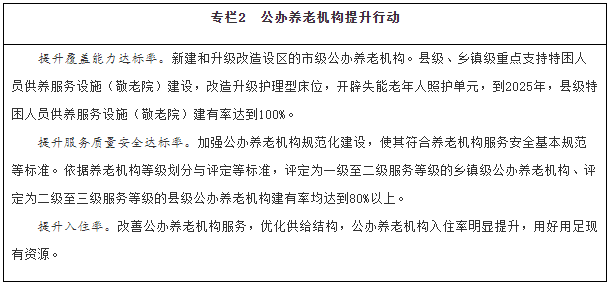 提升公辦養老機構服務(wù)水平。加大現有公辦養老機構改造力度,提升失能老年人照護能力,增設失智老年人照護專(zhuān)區,在滿(mǎn)足政策保障對象入住需求的基礎上優(yōu)先安排失能老年人入住。支持1000個(gè)左右公辦養老機構增加護理型床位。針對公共衛生、自然災害等突發(fā)事件,增設隔離功能,改造消防設施,配備必要的物資和設備,加強人員應急知識培訓,提升公辦養老機構應急保障能力。發(fā)揮公辦養老機構作用,輻射帶動(dòng)周邊各類(lèi)養老機構完善突發(fā)事件預防與應急準備、監測與預警、應急處置與救援等機制。