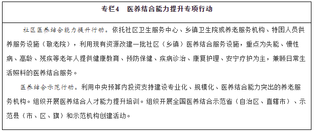 增加醫養結合服務(wù)供給。實(shí)施社區醫養結合能力提升行動(dòng)。積極開(kāi)展基本公共衛生服務(wù)老年健康與醫養結合服務(wù)項目。支持優(yōu)撫醫院、光榮院轉型,開(kāi)展醫養結合服務(wù)。推動(dòng)社區衛生服務(wù)中心與社區養老服務(wù)機構、鄉鎮衛生院與特困人員供養服務(wù)設施(敬老院)、村衛生室與農村幸福院毗鄰建設,采取多種有效方式實(shí)現資源整合、服務(wù)銜接。