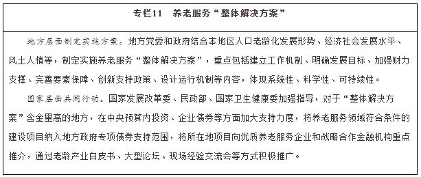 各?。ㄗ灾螀^、直轄市)要根據人口老齡化發(fā)展形勢,制定實(shí)施專(zhuān)項規劃,加強與相關(guān)規劃銜接。各級老齡工作委員會(huì )要發(fā)揮統籌協(xié)調作用,推動(dòng)老齡工作委員會(huì )各成員單位履職盡責,形成工作合力。發(fā)揮養老服務(wù)聯(lián)席會(huì )議制度作用,推進(jìn)養老服務(wù)體系建設,強化區域養老服務(wù)資源統籌管理。支持城市群、都市圈打造養老服務(wù)體系一體化建設格局,形成服務(wù)能力銜接、產(chǎn)業(yè)發(fā)展協(xié)同的合作區域。支持大型城市和區域中心城市推動(dòng)養老產(chǎn)業(yè)集聚發(fā)展,充分發(fā)揮輻射帶動(dòng)和示范作用。推動(dòng)以地級行政區為單位制定“整體解決方案”,將老齡事業(yè)發(fā)展和養老服務(wù)體系建設納入經(jīng)濟社會(huì )發(fā)展全局中通盤(pán)考慮,全方位整合資源力量,充分調動(dòng)各方積極性,推動(dòng)兜底性、普惠型、多樣化三種路徑協(xié)同發(fā)展。