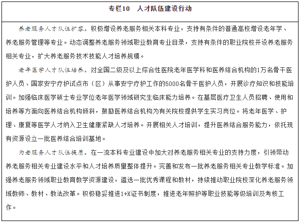 拓寬人才培養途徑。優(yōu)化養老服務(wù)專(zhuān)業(yè)設置,結合行業(yè)發(fā)展新業(yè)態(tài),動(dòng)態(tài)調整增設相關(guān)專(zhuān)業(yè)并完善教學(xué)標準體系,引導普通高校、職業(yè)院校、開(kāi)放大學(xué)、成人高校等加大養老服務(wù)人才培養力度。積極穩妥推進(jìn)1+X證書(shū)(“學(xué)歷證書(shū)+若干職業(yè)技能等級證書(shū)”)制度。大力推進(jìn)養老領(lǐng)域產(chǎn)教融合,培育一批產(chǎn)教融合型養老企業(yè),支持院校和優(yōu)質(zhì)機構共建合辦養老服務(wù)實(shí)訓基地,探索將有條件的養老機構發(fā)展成實(shí)習實(shí)訓點(diǎn)。大力發(fā)展老年學(xué)、養老服務(wù)管理、健康服務(wù)與管理、中醫養生學(xué)相關(guān)專(zhuān)業(yè)本科教育。引導有條件的高校開(kāi)設老年學(xué)、老年醫學(xué)、老年護理學(xué)、老年心理學(xué)、老年社會(huì )學(xué)、老年營(yíng)養學(xué)、老年服務(wù)與管理、老年社會(huì )工作等課程,鼓勵高校自主培養積極應對人口老齡化相關(guān)領(lǐng)域的高水平人才,加大新技術(shù)新應用新業(yè)態(tài)的引才用人力度,為智慧健康養老、老齡科研、適老化產(chǎn)品研發(fā)制造等領(lǐng)域培養引進(jìn)和儲備專(zhuān)業(yè)人才。落實(shí)醫師區域注冊制度,鼓勵醫務(wù)人員到醫養結合機構(同時(shí)具備醫療衛生資質(zhì)和養老服務(wù)能力的醫療衛生機構或養老機構)執業(yè)。在養老機構舉辦的醫療機構中工作的醫務(wù)人員,可參照執行基層醫務(wù)人員相關(guān)激勵政策。