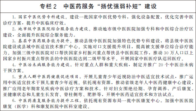 4.健全其他醫療機構中醫藥科室。強化綜合醫院、專(zhuān)科醫院和婦幼保健機構中醫臨床科室、中藥房建設,有條件的二級以上公立綜合醫院設立中醫病區和中醫綜合治療區。鼓勵社會(huì )辦醫療機構設置中醫藥科室。