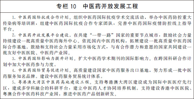 2.深化中醫藥交流合作。鞏固拓展與有關(guān)國家的政府間中醫藥合作,加強相關(guān)政策法規、人員資質(zhì)、產(chǎn)品注冊、市場(chǎng)準入、質(zhì)量監管等方面的交流。鼓勵和支持有關(guān)中醫藥機構和團體以多種形式開(kāi)展產(chǎn)學(xué)研用國際交流與合作。促進(jìn)中醫藥文化海外傳播與技術(shù)國際推廣相結合。鼓勵和支持社會(huì )力量采用市場(chǎng)化方式,與有合作潛力和意愿的國家共同建設一批友好中醫醫院、中醫藥產(chǎn)業(yè)園。加強與港澳臺地區的中醫藥交流合作,建設粵港澳大灣區中醫藥高地,打造高水平中醫醫院、中醫優(yōu)勢專(zhuān)科、人才培養基地和科技創(chuàng )新平臺。