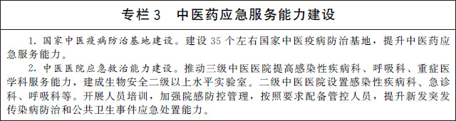 加強中醫藥應急救治能力建設。依托高水平三級甲等中醫醫院,建設覆蓋所有省份的國家中醫疫病防治基地,依托基地組建中醫疫病防治隊伍,提升中醫緊急醫學(xué)救援能力。三級公立中醫醫院和中西醫結合醫院(不含中醫專(zhuān)科醫院)全部設置發(fā)熱門(mén)診,加強感染性疾病、急診、重癥、呼吸、檢驗等相關(guān)科室建設,提升服務(wù)能力。
