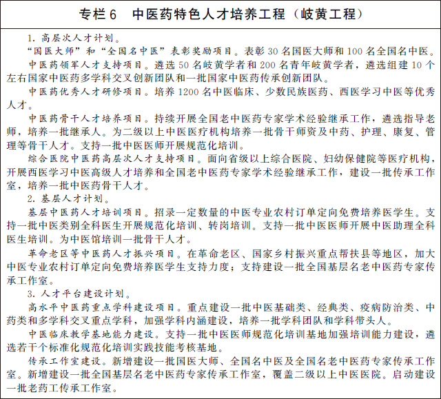 2.強化中醫藥特色人才隊伍建設。實(shí)施中醫藥特色人才培養工程(岐黃工程)。打造岐黃學(xué)者品牌,持續開(kāi)展岐黃學(xué)者培養、全國中醫臨床優(yōu)秀人才研修等項目,做強領(lǐng)軍人才、優(yōu)秀人才、骨干人才梯次銜接的高層次人才隊伍。建設一批高水平中醫藥重點(diǎn)學(xué)科。構建符合中醫藥特點(diǎn)的人才培養模式,發(fā)展中醫藥師承教育,建立高年資中醫醫師帶徒制度,與職稱(chēng)評審、評優(yōu)評先等掛鉤,持續推進(jìn)全國名老中醫藥專(zhuān)家傳承工作室、全國基層名老中醫藥專(zhuān)家傳承工作室建設。將綜合醫院、婦幼保健院等醫療機構中醫藥人才納入各類(lèi)中醫藥人才培養項目。按照“下得去、留得住、用得上”的要求,加強基層中醫藥人才隊伍建設,根據需求合理確定中醫專(zhuān)業(yè)農村訂單定向免費培養醫學(xué)生規模,在全科醫生特崗計劃中積極招收中醫醫師。推廣中醫藥人員“縣管鄉用”,探索推進(jìn)輪崗制與職稱(chēng)評審相銜接。適當放寬長(cháng)期服務(wù)基層的中醫醫師職稱(chēng)晉升條件,表彰獎勵評優(yōu)向基層一線(xiàn)和艱苦地區傾斜,引導中醫藥人才向基層流動(dòng)。