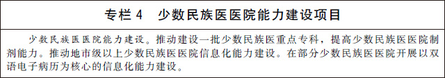 3.發(fā)展少數民族醫藥。加強少數民族醫醫療機構建設,提高民族地區基層醫療衛生機構少數民族醫藥服務(wù)能力。改善少數民族醫醫院基礎設施條件,加強少數民族醫醫院專(zhuān)科能力、制劑能力和信息化能力建設。建立符合少數民族醫醫療機構自身特點(diǎn)和發(fā)展規律的績(jì)效評價(jià)指標體系。加大少數民族醫藥防治重大疾病和優(yōu)勢病種研究力度,有效傳承特色診療技術(shù)和方法。鼓勵和扶持少數民族醫藥院校教育、師承教育和繼續教育。加大對少數民族醫藥的傳承保護力度,持續開(kāi)展少數民族醫藥文獻搶救整理工作,推動(dòng)理論創(chuàng )新和技術(shù)創(chuàng )新。