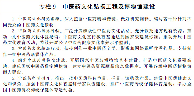 2.發(fā)展中醫藥博物館事業(yè)。開(kāi)展國家中醫藥博物館基本建設,建成國家中醫藥數字博物館。促進(jìn)中醫藥博物館體系建設,強化各級各類(lèi)中醫藥博物館收藏研究、社會(huì )教育、展覽策劃和文化服務(wù)功能,加強數字化建設,組織內容豐富的中醫藥專(zhuān)題展覽。